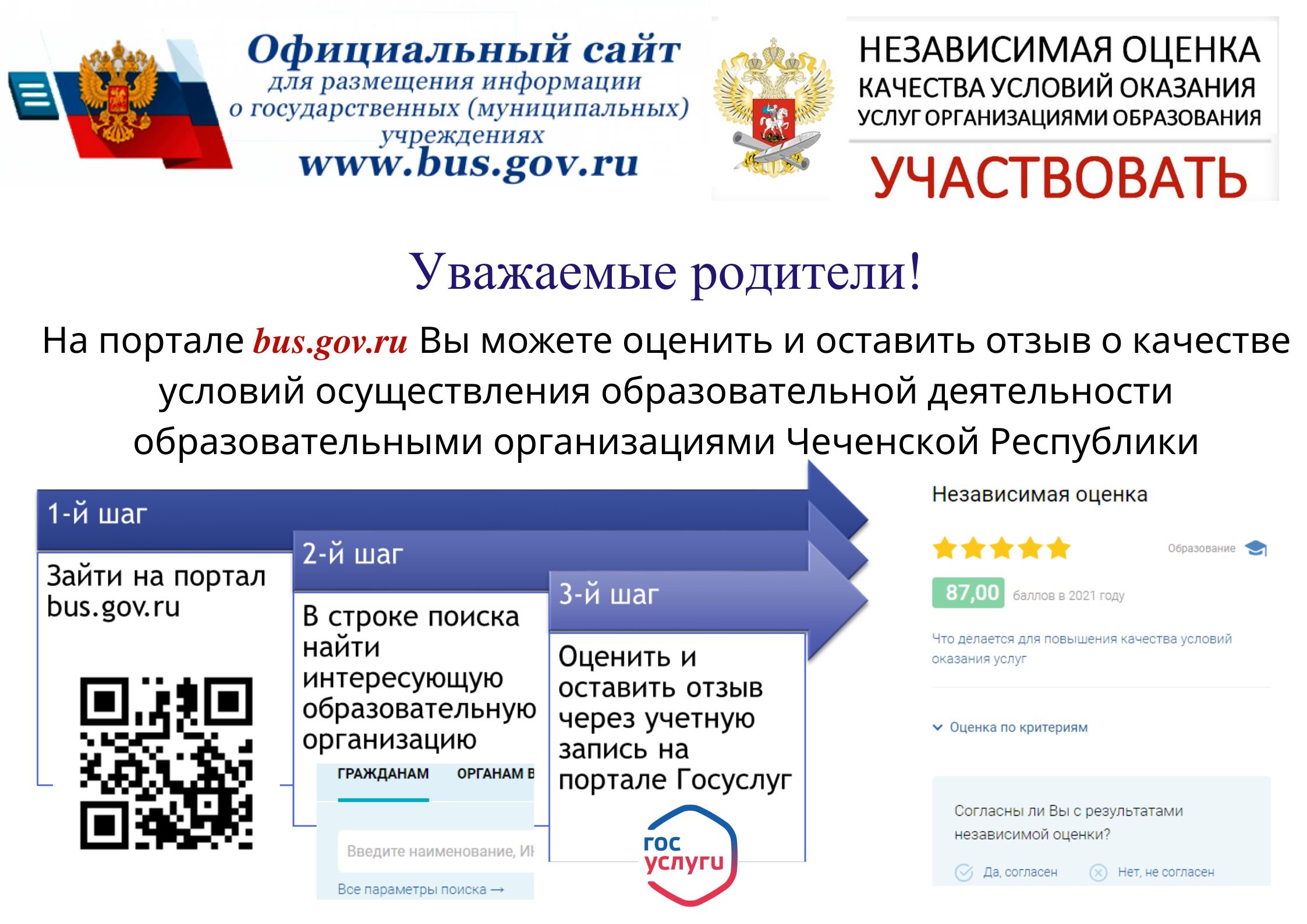 На портале bus.gov.ru Вы можете оценить и оставить отзыв о качестве условий осуществления образовательной деятельности образовательными организациями Чеченской Республики